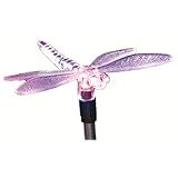I got this as a gift from my mother, but the dragonfly's wings broke off when dropped and I had to order a replacement. This is cute and performs as described. The colors change every couple of seconds and the light is not so bright as to be annoying. I have mine near the front yard where the kids can see it, but it would look cool to have several of them placed in high grass or plants.